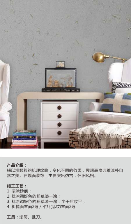 稻草漆稻草漆又名生態稻草漆,是最原始、最樸素、最溫馨宜人的建筑材料。引進日本技術加工工藝,利用稻桿、微空粉末、石英粉等天然材料制成生態稻草漆,讓您時刻擁有自然的鄉土氣息,轉身于寧靜、古樸的環境中。稻草漆生產材料選用的都是稻桿、 蛭石粉、微空粉末、 石英粉等天然材料,不用擔心會產生 甲醛、VOC排放等問題。